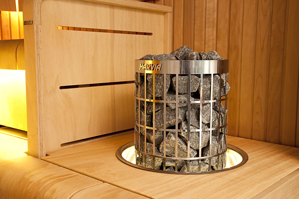 Les lampes à DEL qui brillent depuis le bas accentuent les surfaces fracturées des pierres du sauna, ce qui permet d’admirer le jet d’eau sur les pierres.